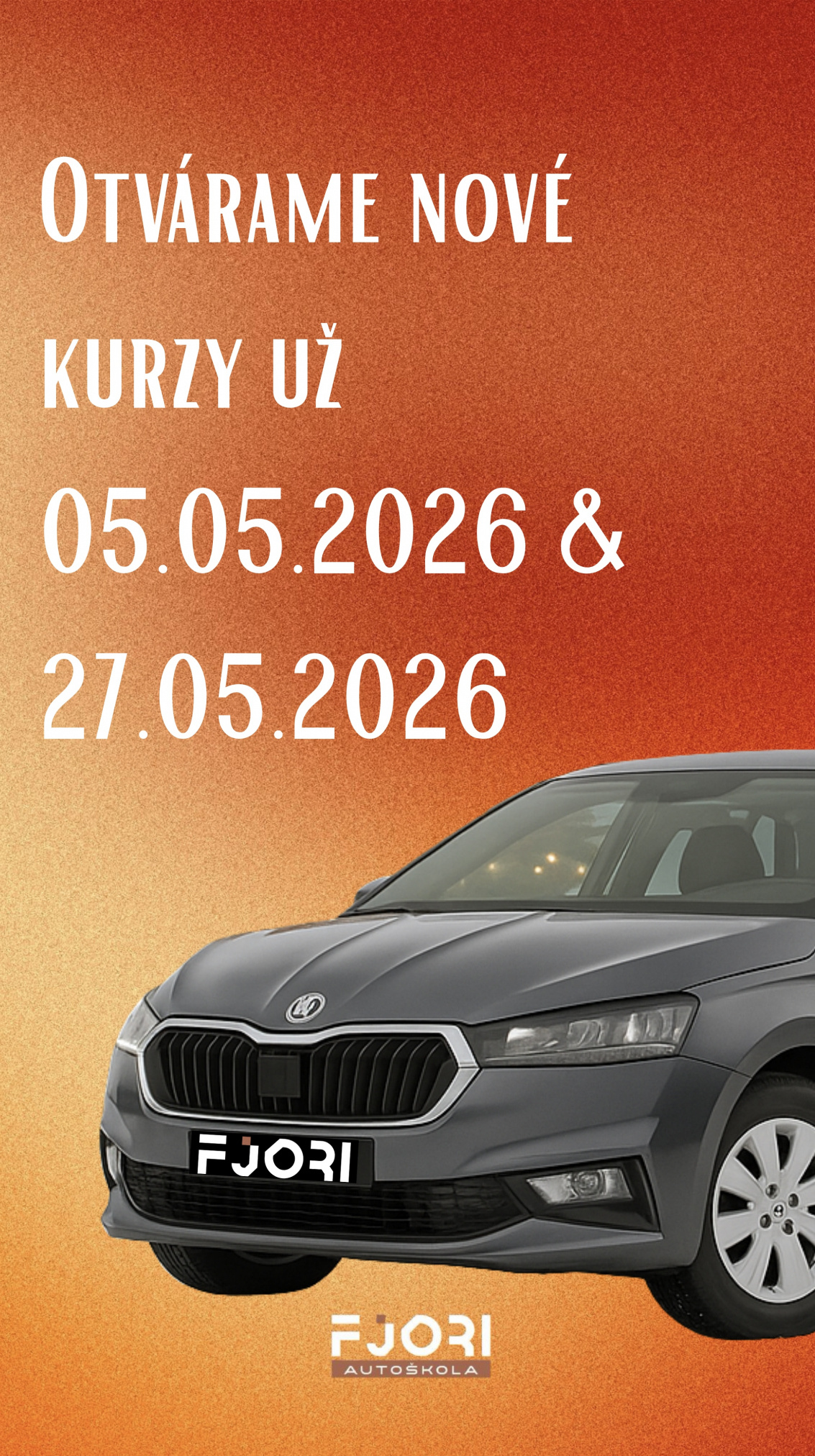 Informačné stretnutie/zápis: 13.04. a 15.04 o 15:00 alebo podľa individuálnej dohody na tel. čísle +421 901 736 233 alebo na info@autoskolafjori.sk